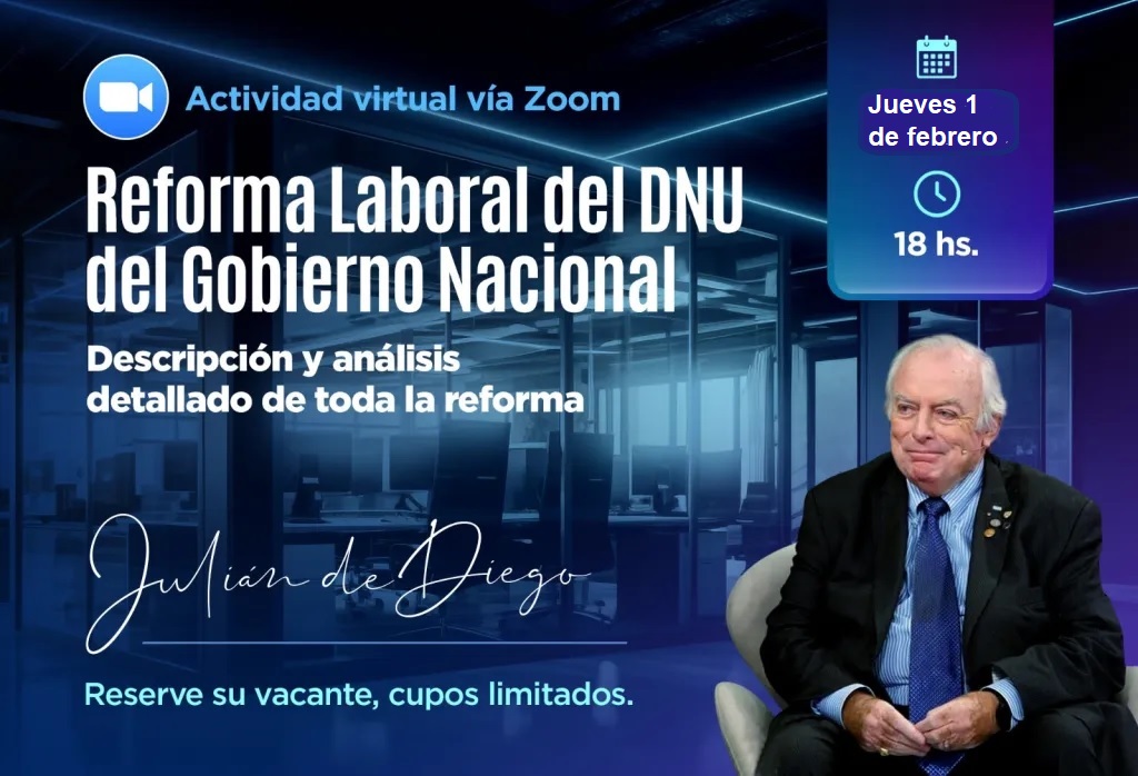 - Desarrollo de las acciones judiciales, de las sentencias dictadas sobre el DNU, las apelaciones y sus resultados. Derogación de las multas. Otras derogaciones complementarias. Registro laboral electrónico bajo el SISTEMA UNICO. Reformas de la Ley de Contrato de Trabajo: Ámbito de aplicación; principio de la norma mas favorable; irrenunciabilidad; presunción de existencia del contrato de trabajo; mediación intermediación solidaridad subsidiariedad; certificados de trabajo; periodo de prueba; pago de salarios; contratistas e intermediarios; recibos de sueldo; conservación de recibos; maternidad; jornada de trabajo dinámica; justa causa de despido; indemnización por antigüedad; despido discriminatorio; compensación de las indemnizaciones pagadas; actualización de los créditos laborales; pago en juicio. Convenciones colectivas de trabajo: caducidad de la ultraactividad; clausulas de excepción; disponibilidad colectiva. Asociaciones Sindicales: asambleas y congresos; acciones prohibidas; toma de establecimiento; aceptación de la libertad de trabajo; daños a las personas o a la propiedad, sanciones. Viajantes de Comercio: derogación; remisión de la ley general. Régimen Legal del Contrato de Teletrabajo: tareas de cuidados; reversibilidad; prestaciones transnacionales; registro electrónico y automático de la modalidad contractual. Trabajadores independientes con colaboradores: emprendedores; dependientes a cargo; vinculo autónomo. Servicios esenciales: conflictos colectivos con prestación normal; enunciación de servicios esenciales; enunciación de actividades de importancia trascendental; comisión de garantías; nuevas funciones. Análisis de la viabilidad constitucional del DNU.