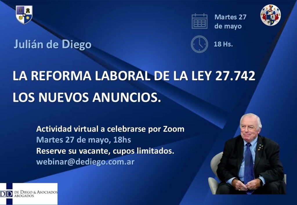 Martes 27 de mayo 18hs | LA REFORMA LABORAL DE LA LEY 27.742. LA HUELGA COMO SERVICIO ESENCIAL (DNU 340/2025). Por Julián A. de Diego, virtual por Zoom.
