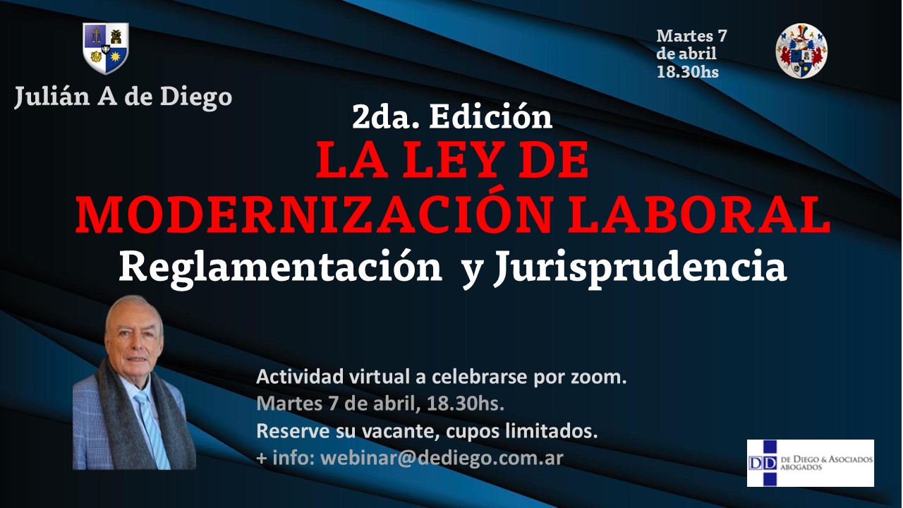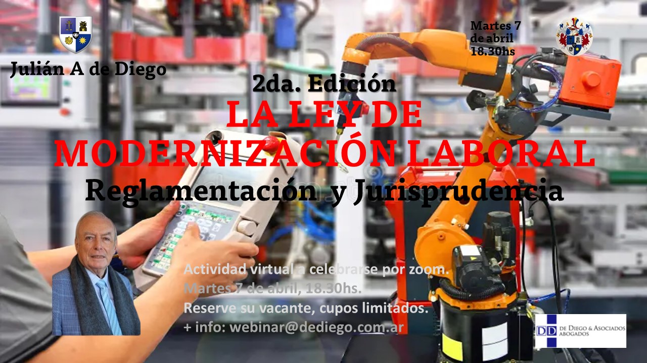 Martes 7 de abril 18.30hs | 2da. Edición, LA LEY DE MODERNIZACION LABORAL, Ley 27.802. Por Julián A. de Diego, virtual por Zoom.